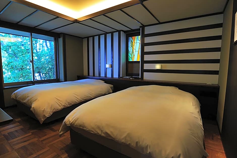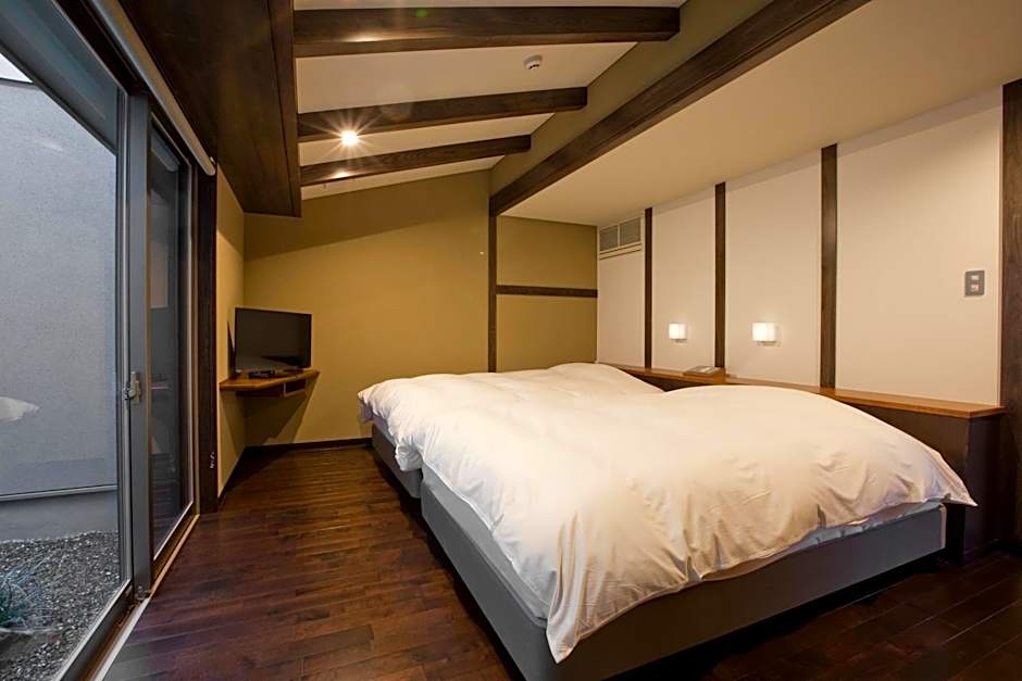 The spacious quadruple room provides air conditioning, tatami, a terrace with garden views as well as a private bathroom featuring a bath. The unit offers 2 beds and 2 futons.